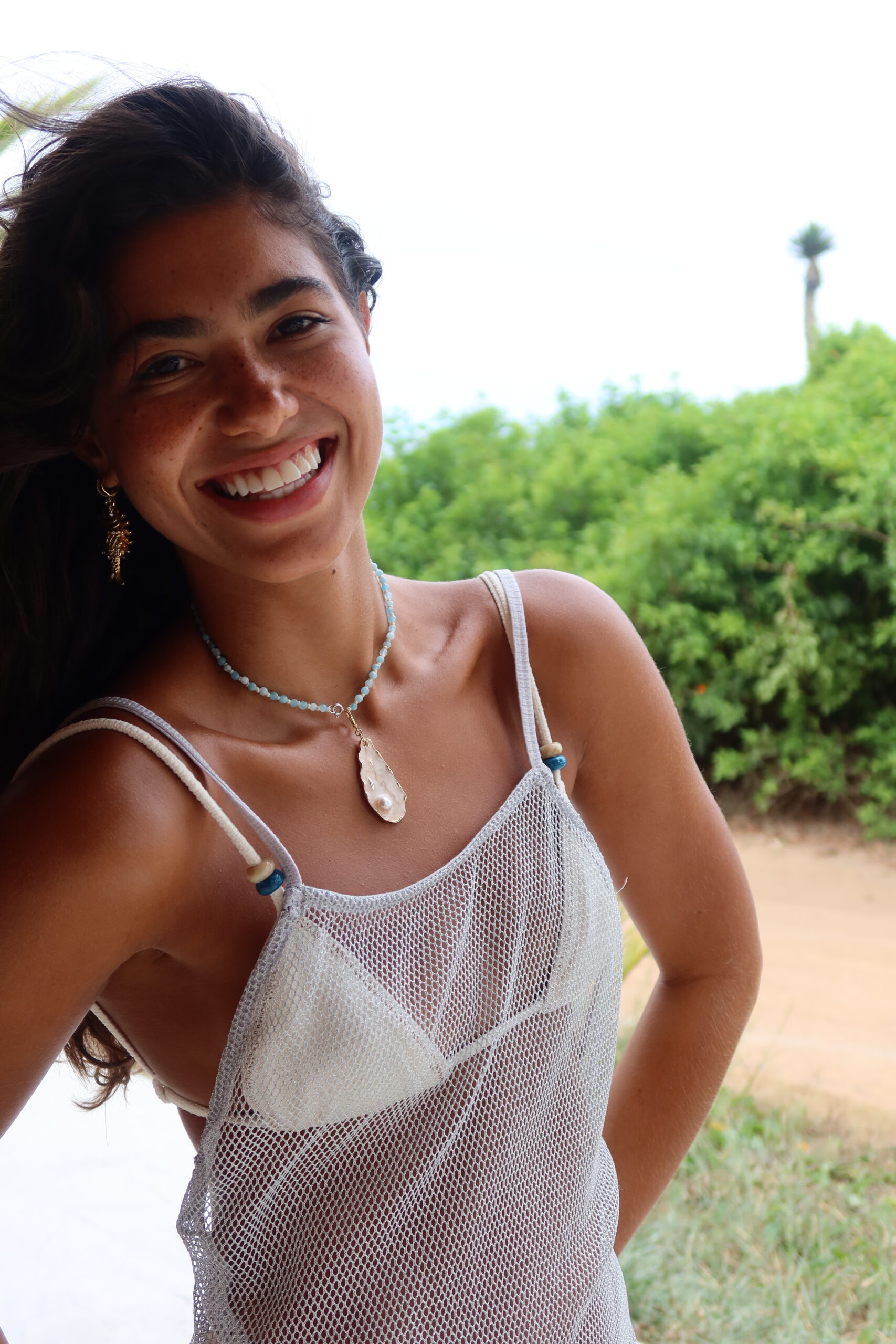 Vestido Prata - Vestido longo com fenda lateral, confeccionado em telinha de malha com fios de lurex. O vestido Thai tem modelagem ajustada, alças finas e recortes que valorizam o corpo com sutileza. O tecido é leve, transparente e tem caimento fluido — ideal para usar por cima dos biquínis nos dias de sol. O brilho em lurex traz um ar sofisticado sem pesar no visual. MODELO VESTE P.